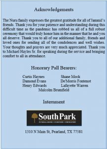 Loved ones that will miss Jammil until they meet again are his aunts Jacquelyne Kyle Bennett of Huntsville, Alabama; Rica Jones (Archie) of Gadsden, Alabama; and Vivian Grayson (Curtis) of Wycliffe, Ohio; uncles Harold Kyle (Fredrica) of Cleveland, Ohio, Henry Warren, Jr. (Beverly) of Huntsville, Alabama’, Larry Warren (Teresa) of Cleveland, Ohio; Ronald Warren of Oneonta, Alabama and many other cousins and loving friends.